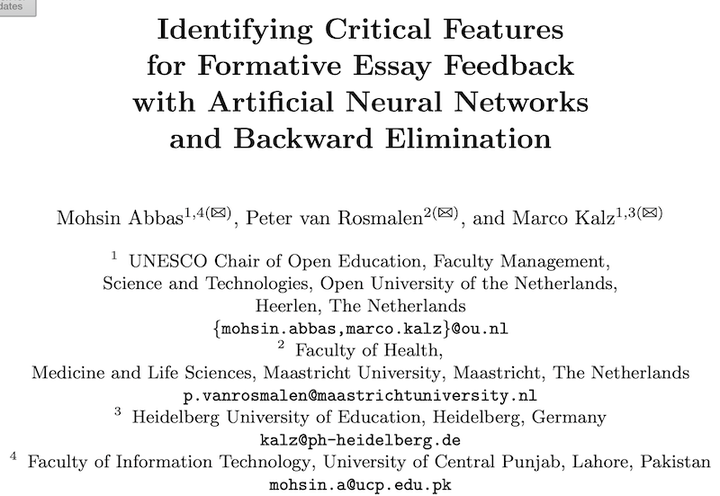 Abbas, M., van Rosmalen, P., & Kalz, M. (2019). Identifying critical features for formative essay feedback with artificial neural networks and backward elimination. In Scheffel, M., Broisin, J., Pammer-Schindler, V., Ioannou, A., Schneider, J. (eds) Transforming Learning with Meaningful Technologies. EC-TEL 2019. (pp. 396-408). Lecture Notes in Computer Science, vol 11722. Springer, Cham. https://doi.org/10.1007/978-3-030-29736-7_30