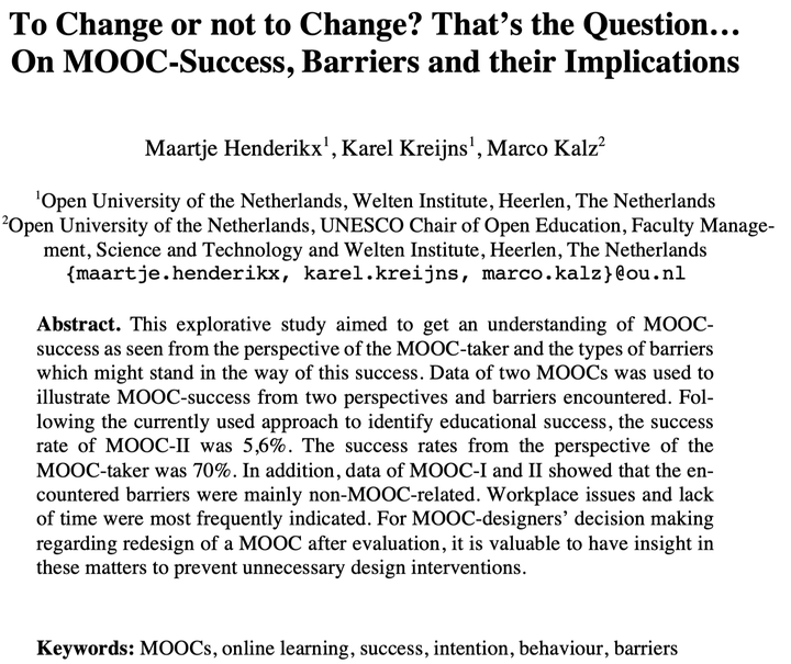 Henderikx, M., Kreijns, K., & Kalz, M. (2017). To change or not to change? That’s the question… On MOOC-success, Barriers and their Implications. In C. Delgado Kloos, P. Jermann, M. Pérez-Sanagustín, D. T. Seaton, & S. White (Eds.), Digital education: Out to the world and back to the campus: 5th European MOOCs Stakeholders Summit, EMOOCs 2017, Madrid, Spain, May 22-26, 2017 Proceedings (pp. 210-216). Springer. https://doi.org/10.1007/978-3-319-59044-8_25