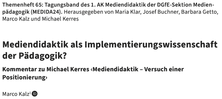 Kalz, M. (2025). Mediendidaktik als Implementierungswissenschaft der Pädagogik? Kommentar zu Michael Kerres ‹Mediendidaktik – Versuch einer Positionierung›. MedienPädagogik: Zeitschrift für Theorie Und Praxis Der Medienbildung, 65(MEDIDA24), 45–49. https://doi.org/10.21240/mpaed/65/2025.04.29.X*