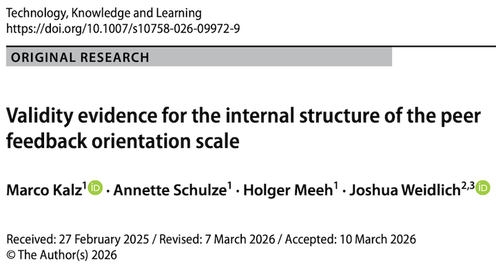 Kalz, M., Schulze, A., Meeh, H., & Weidlich, J. (2026). Validity evidence for the internal structure of the peer feedback orientation scale. Technology, Knowledge and Learning, 1-16. https://doi.org/10.1007/s10758-026-09972-9